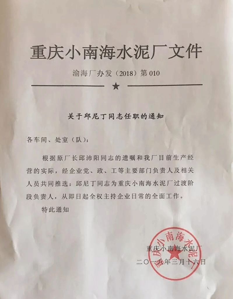 【水泥人網(wǎng)】2018年03月16日,重慶小南海水泥廠廠辦發(fā)布(2018)第010文件:根據(jù)原廠長(zhǎng)邱沛陽(yáng)同志的遺囑,并結(jié)合本廠目前生產(chǎn)經(jīng)營(yíng)的實(shí)際情況,經(jīng)本廠黨、政、工等主要部門負(fù)責(zé)人及相關(guān)人員共同推選,由邱尼丁同志擔(dān)任重慶小南海水泥廠過渡階段負(fù)責(zé)人,全權(quán)主持企業(yè)日常的全面工作。