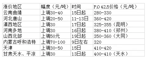 正當市場還在消化和觀察近日漲價通知落實情況時,20日,有風(fēng)聲傳出東北地區(qū)或25-27日推漲水泥價格100-150元/噸。東北地區(qū)調(diào)整后42.5散裝水泥出廠掛牌提至450-500元。