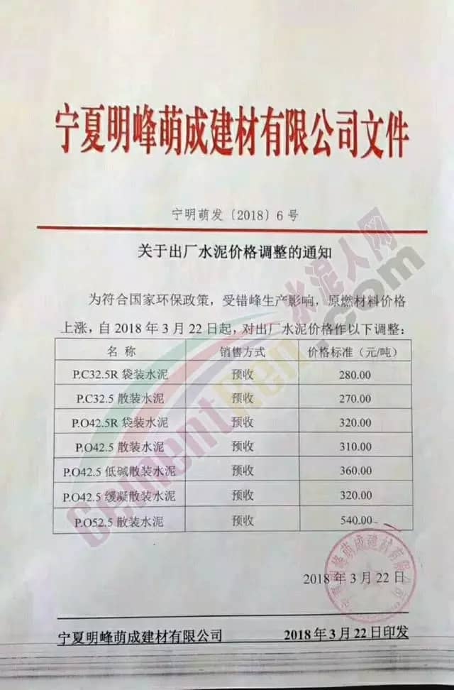 寧夏明峰萌成建材有限公司調(diào)價(jià)通知