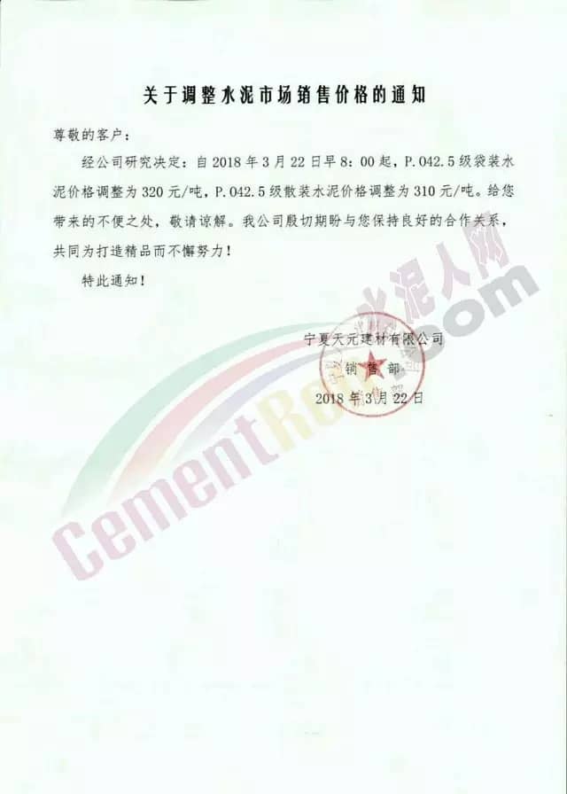 寧夏天元建材有限公司調(diào)價(jià)通知