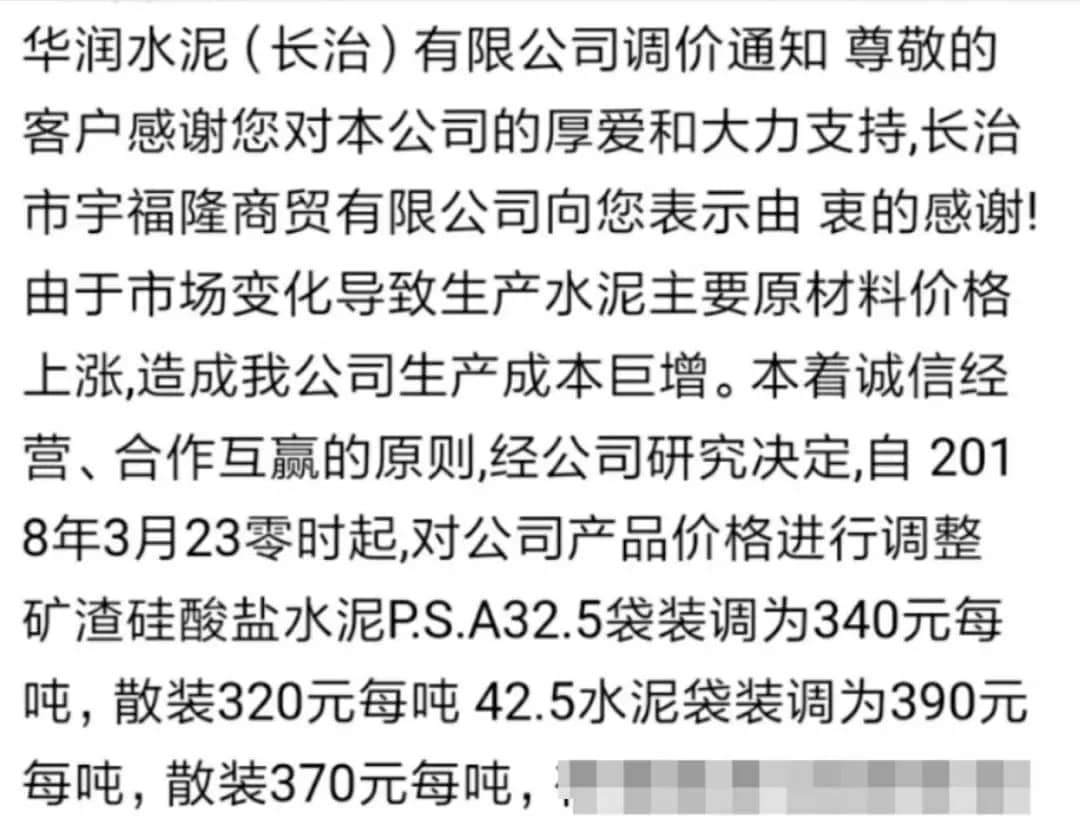 華潤(rùn)水泥(長(zhǎng)治)有限公司調(diào)價(jià)通知
