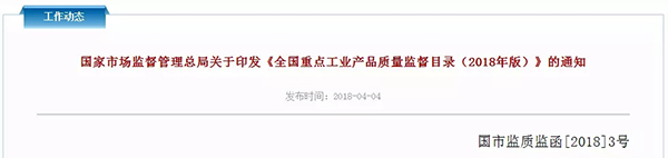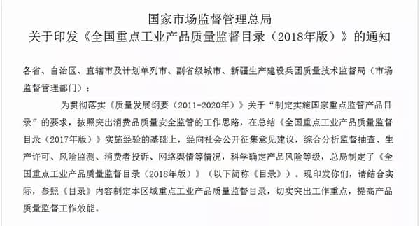 《全國(guó)重點(diǎn)工業(yè)產(chǎn)品質(zhì)量監(jiān)督目錄(2018年版)》