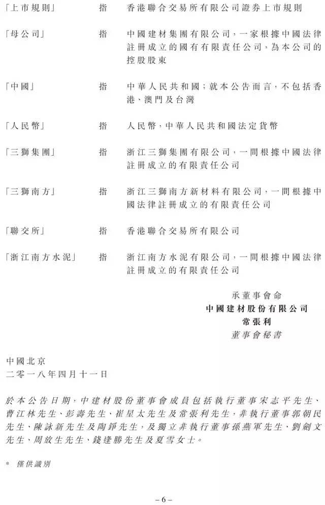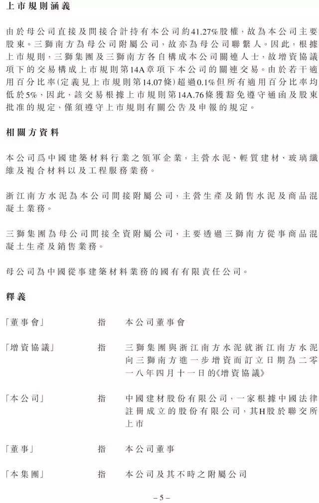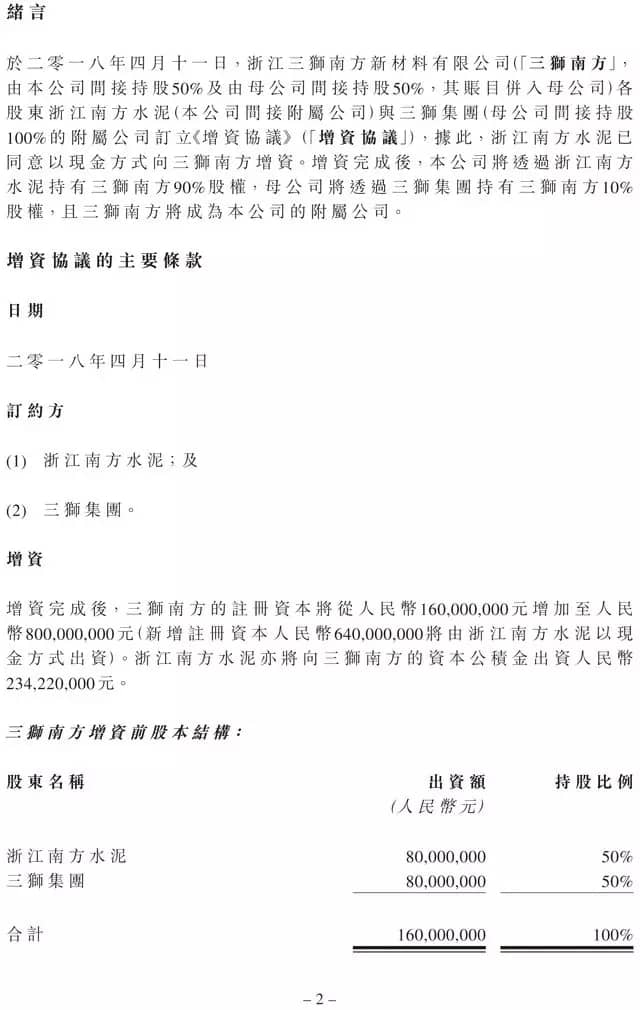 增資完成后,公司透過浙江南方水泥持有三獅南方90%股權(quán),母公司透過三獅集團持有三獅南方10%股權(quán),且三獅南方成為公司的附屬公司。