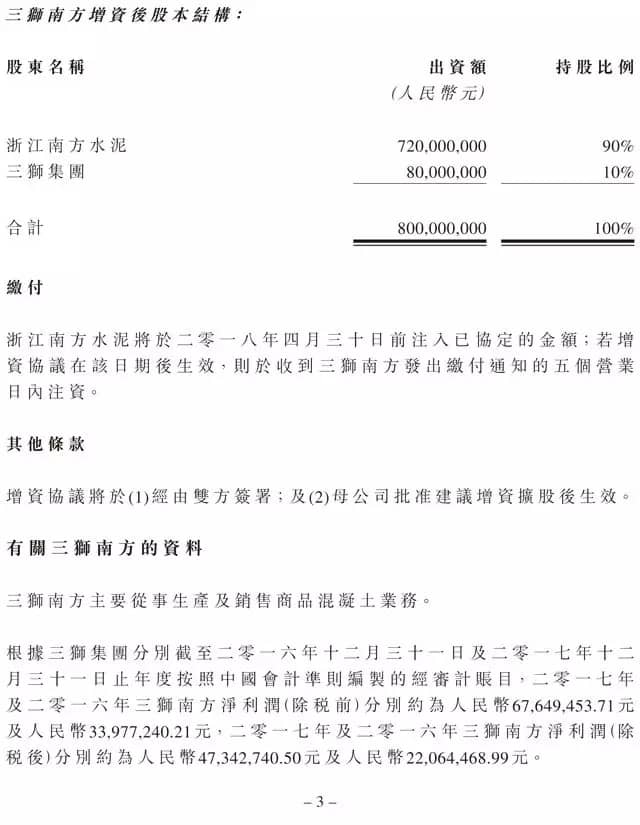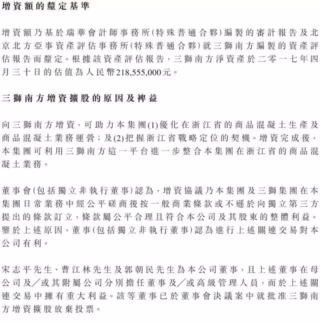 公告顯示,三獅南方主要從事生產(chǎn)及銷售商品混凝土業(yè)務(wù)。截至2016年、2017年12月31日止年度按照中國會計準則編制的經(jīng)審計賬目,其稅前凈利潤分別約人民幣6764.9萬元及3397.7萬元,稅后凈利潤分別約人民幣4734.27萬元及2206.45萬元。