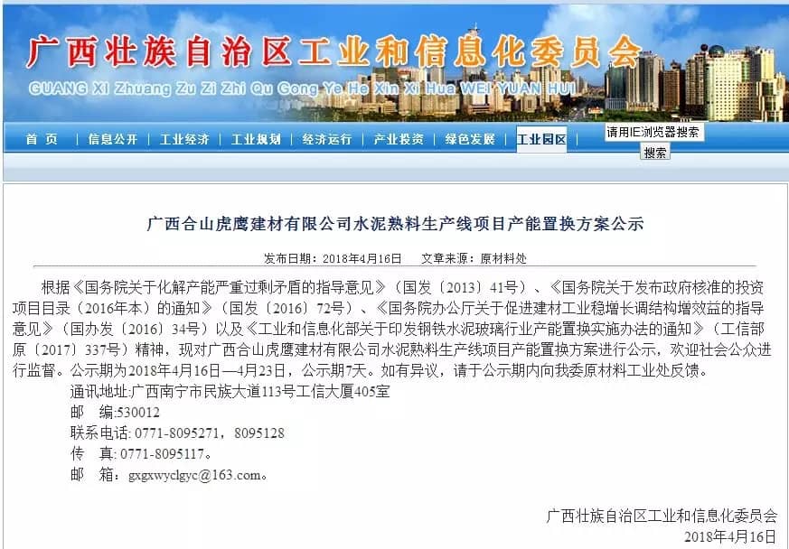 【水泥人網(wǎng)】日前,廣西壯族自治區(qū)工信委公布了《廣西合山虎鷹建材有限公司水泥熟料生產(chǎn)線項目產(chǎn)能置換方案》公示稱: 根據(jù)《國務院關于化解產(chǎn)能嚴重過剩矛盾的指導意見》(國發(fā)〔2013〕41號)、《國務院關于發(fā)布政府核準的投資項目目錄(2016年本)的通知》(國發(fā)〔2016〕72號)、《國務院辦公廳關于促進建材工業(yè)穩(wěn)增長調(diào)結(jié)構(gòu)增效益的指導意見》(國辦發(fā)〔2016〕34號)以及《工業(yè)和信息化部關于印發(fā)鋼鐵水泥玻璃行業(yè)產(chǎn)能置換實施辦法的通知》(工信部原〔2017〕337號)精神,對廣西合山虎鷹建材有限公司水泥熟料生產(chǎn)線項目產(chǎn)能置換方案進行公示,歡迎社會公眾進行監(jiān)督。公示期為2018年4月16日—4月23日,公示期7天。公示原文如下: