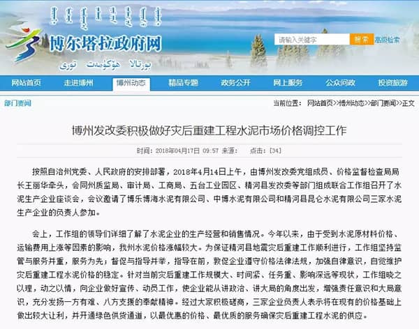 按照新疆博爾塔拉蒙古自治州黨委、人民政府的安排部署,2018年4月14日上午,由博州發(fā)改委黨組成員、價(jià)格監(jiān)督檢查局局長王麗華牽頭,會(huì)同州質(zhì)監(jiān)局、審計(jì)局、工商局、五臺(tái)工業(yè)園區(qū)、精河縣發(fā)改委等部門組成聯(lián)合工作組召開了水泥生產(chǎn)企業(yè)座談會(huì),會(huì)議邀請(qǐng)了博樂博海水泥有限公司、中博水泥有限公司和精河縣昆侖水泥有限公司三家水泥生產(chǎn)企業(yè)的負(fù)責(zé)人參加。