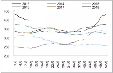 水泥年初以來價(jià)格出現(xiàn)季節(jié)性走弱,主要集中于華東、中南以及西南地區(qū),其余地區(qū)價(jià)格仍然維持高位堅(jiān)挺,截至3月2日,全國高標(biāo)水泥平均報(bào)價(jià) 398.33元/噸,較去年同期高 21.88%,仍處于歷史高位水平。前期價(jià)格下降主要原因?yàn)?,一方面南方雨雪天氣?dǎo)致,下游需求減弱,另一方面為組織沿江地區(qū)進(jìn)口熟料的增加,近期主要由于春節(jié)因素,下游企業(yè)尚未開工,生產(chǎn)商通過價(jià)格下調(diào)打開市場銷量,刺激開工后下游采購的積極性。根據(jù)過去數(shù)年春節(jié)前后水泥價(jià)格波動規(guī)律的比較可以明顯看出,農(nóng)歷春節(jié)后,水泥市場價(jià)格仍將持續(xù)一段時(shí)間的低迷,待開工恢復(fù)后才出現(xiàn)回暖,因此近期個別區(qū)域價(jià)格仍有下探現(xiàn)象,屬正常。