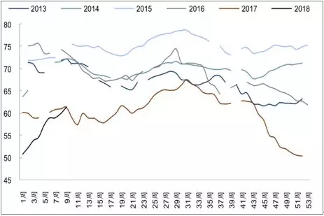 玻璃生產(chǎn)線庫存季節(jié)性上升(單位:萬重箱)