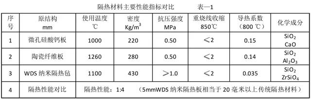 WDS納米隔熱氈的抗壓強度比較大,同時其隔熱性遠超過纖維板,同樣厚度是纖維板的4倍隔熱效果,這樣的優(yōu)越性能就可以采用很薄的厚度(5毫米),達到非常優(yōu)異的隔熱效果,下表是材料的性能對比表—1。