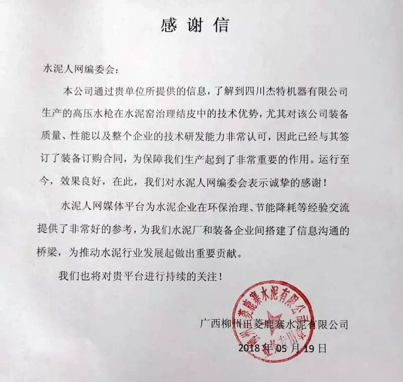 正菱鹿寨水泥負責人表示:通過水泥人網(wǎng)介紹的四川杰特機器有限公司的產(chǎn)品對正菱鹿寨水泥的生產(chǎn)起到了很大的推動作用。