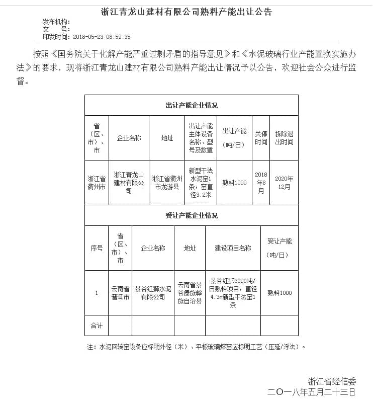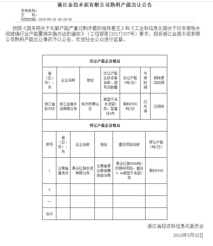 兩則公告中出讓的熟料產(chǎn)能受讓方均為位于云南省景谷傣族彝族自治縣的景谷紅獅水泥有限公司,建設(shè)項(xiàng)目為景谷紅獅3000t/d熟料項(xiàng)目(直徑4.3m新型干法窯1條)。其中由浙江金首水泥有限公司出讓2500t/d熟料產(chǎn)能,浙江青龍山建材有限公司出讓1000t/d熟料產(chǎn)能,合計(jì)3500t/d。