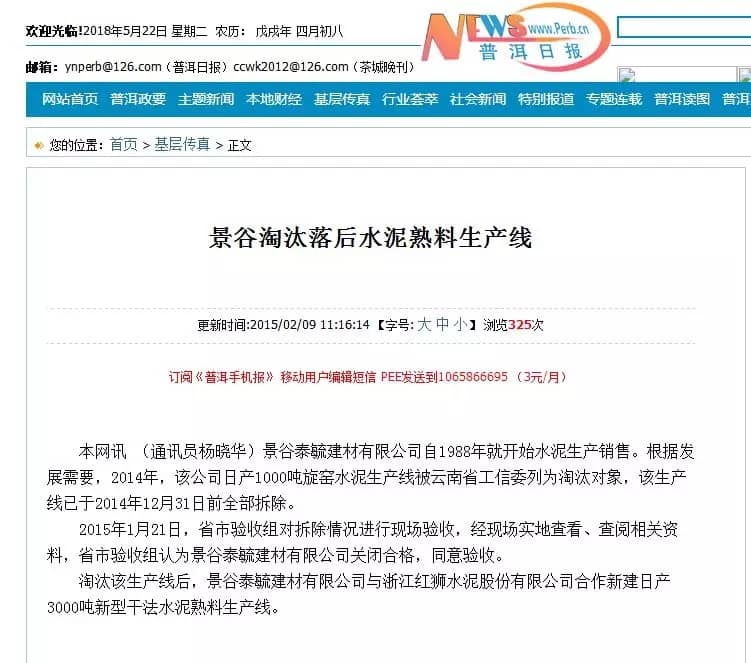 另?yè)?jù)《普洱日?qǐng)?bào)》2015年2月9日消息,景谷泰毓建材有限公司原生產(chǎn)線建設(shè)規(guī)模為日產(chǎn)1000噸旋窯水泥生產(chǎn)線。在2014年被列為淘汰對(duì)象,于2014的12月31日前全部拆除。且于2015年1月驗(yàn)收通過(guò)。淘汰該生產(chǎn)線后景谷泰毓建材有限公司與浙江紅獅水泥股份有限公司合作新建日產(chǎn)3000噸新型干法水泥熟料生產(chǎn)線。