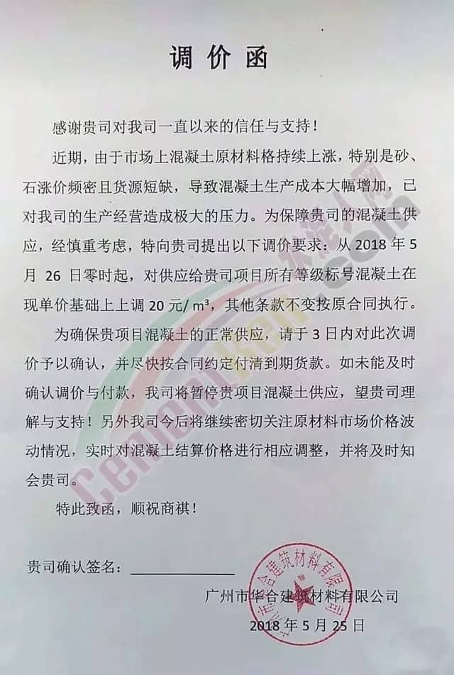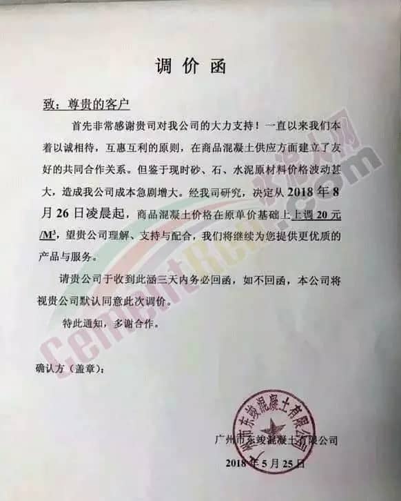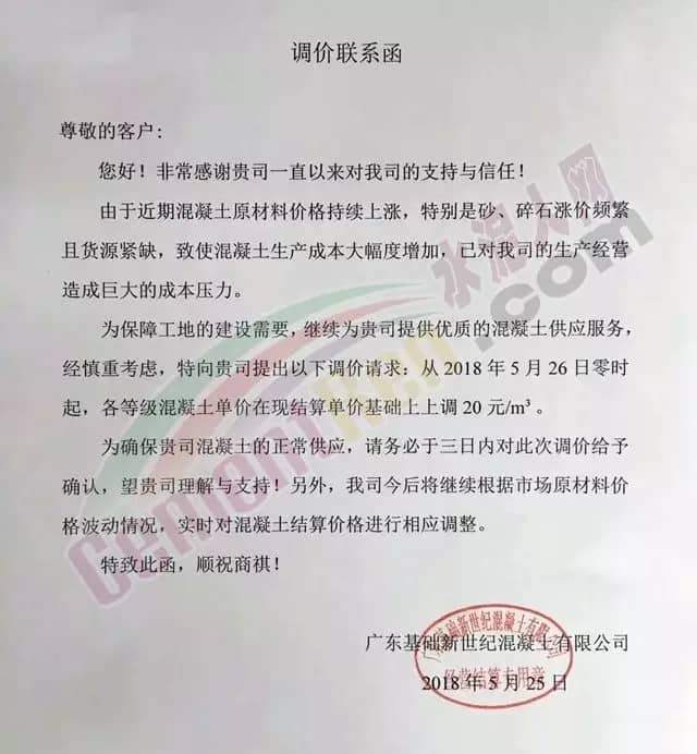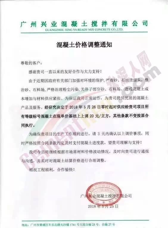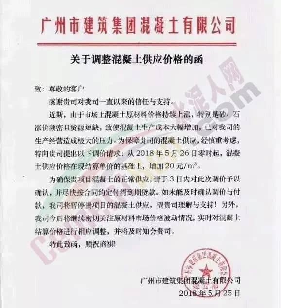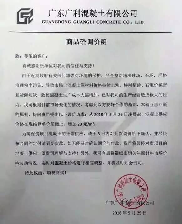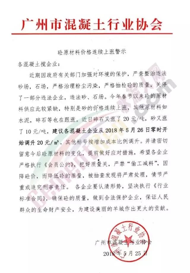近日碎石又漲了20元/噸,砂又漲了10元/噸。建議各混凝土企業(yè)從2018年5月26日零時(shí)開始調(diào)升20元/立方。其他標(biāo)號按增加成本比例調(diào)升。并請密切留意今后砼原材料的變化,提前做好應(yīng)對措施。