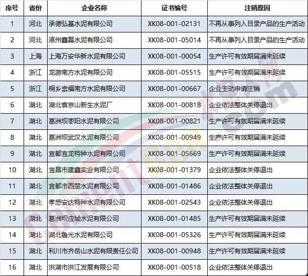 注銷工業(yè)產(chǎn)品生產(chǎn)許可證的水泥企業(yè)名單
