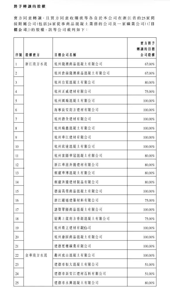 公告顯示,上述目標(biāo)公司(建德更樓礦業(yè)有限公司除外)主要從事生產(chǎn)及銷售商品混凝土。其中建德更樓礦業(yè)有限公司主要從事建筑用砂石骨料礦的籌建及開采。轉(zhuǎn)讓完成后,目標(biāo)公司將繼續(xù)為該公司間接持有的附屬公司。