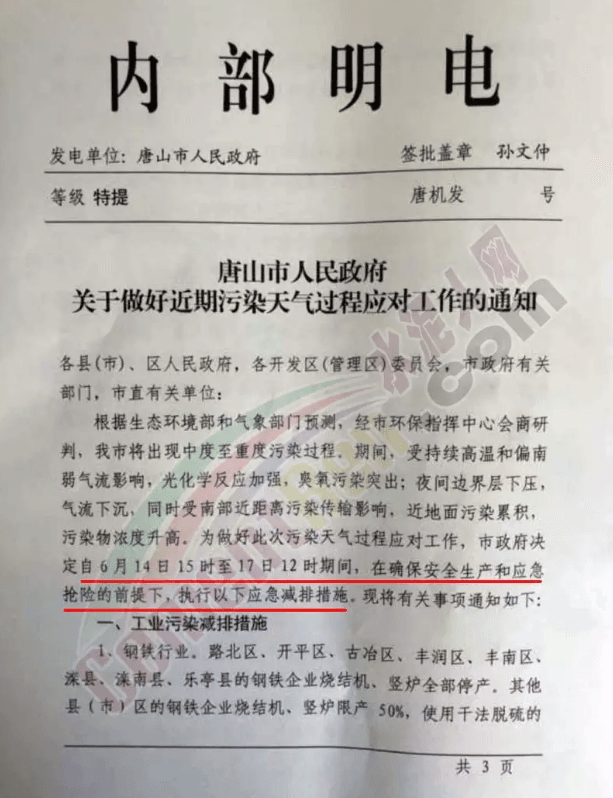 日前,唐山市人民政府再發(fā)明電《關(guān)于做好近期污染天氣過程應(yīng)對工作的通知》稱:根據(jù)生態(tài)環(huán)境部和氣象部門預(yù)測,經(jīng)市環(huán)保指揮中心會(huì)商研判,唐山市將出現(xiàn)中度至重度污染過程。期間受持續(xù)高溫和偏南弱氣流影響,光化學(xué)反應(yīng)加強(qiáng),臭氧污染突出;夜間邊界層下壓氣流下沉,同時(shí)受南部近距污染傳輸影響,近地面污染累積,污染物濃度升高。為做好此次污染天氣過程應(yīng)對工作,唐山市政府決定 自6月14日15時(shí)至17日12時(shí)期間,在確保安全生產(chǎn)和應(yīng)急搶險(xiǎn)的前提下,執(zhí)行應(yīng)急減排措施。