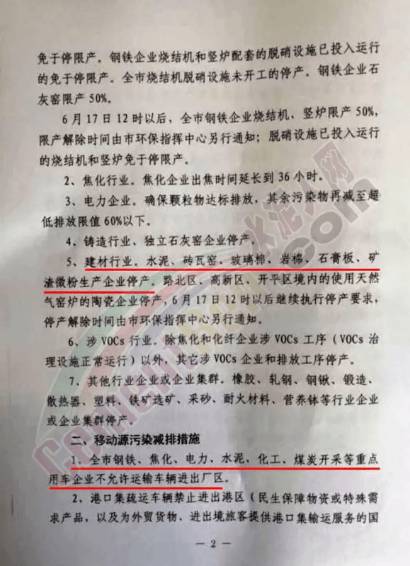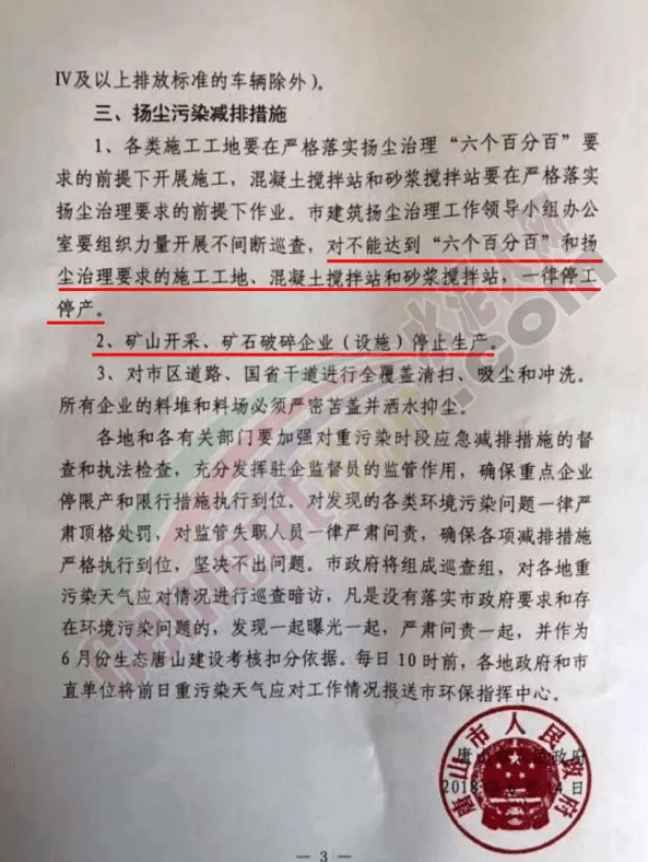 工業(yè)減排方面,建材行業(yè),水泥磚瓦窯、石膏板、礦渣微粉生產(chǎn)企業(yè)停產(chǎn);移動(dòng)源污染減排方面要求全市鋼鐵、水泥、煤炭開采等重點(diǎn)用車企業(yè)不允許運(yùn)輸車輛進(jìn)出廠區(qū);揚(yáng)塵污染減排方面要求各類施工工地要在嚴(yán)格落實(shí)揚(yáng)塵治理“六個(gè)百分百”要求的前提下開展施工,混凝土攪拌站和砂漿攪拌站要在嚴(yán)格落實(shí)揚(yáng)塵治理要求的前提下作業(yè)。對不能達(dá)到“六個(gè)百分百”和揚(yáng)塵治理要求的施工工地混凝土攪拌站和砂漿攪拌站,一律停工停產(chǎn)。礦山開采、礦石破碎企業(yè)(設(shè)施)停止生產(chǎn)。