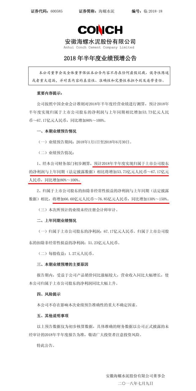 7月9日晚間海螺水泥、華新水泥、萬年青水泥等分別發(fā)布2018年上半年業(yè)績預(yù)告