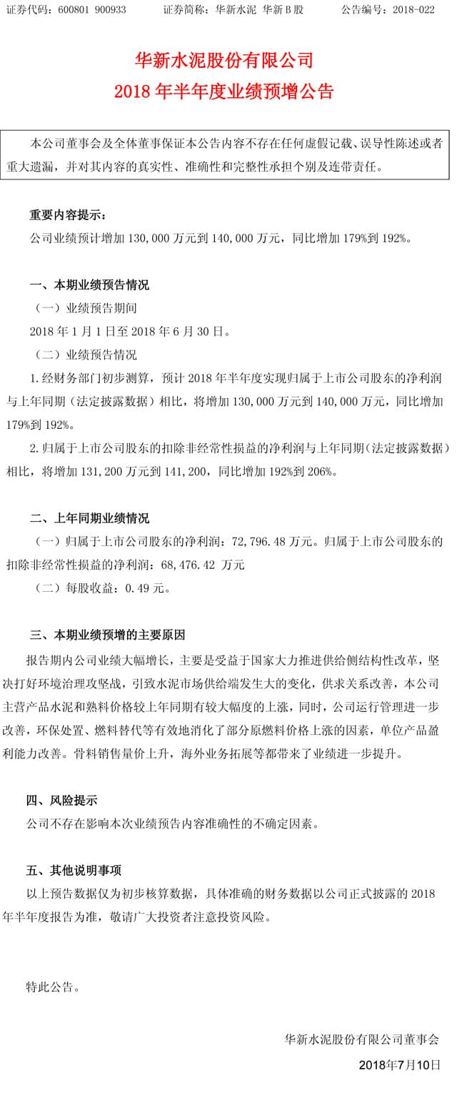 預(yù)計2018年半年度實現(xiàn)的凈利潤同比增加179%到192%。公司上年同期盈利7.28億元。受益于國家大力推進供給側(cè)結(jié)構(gòu)性改革,報告期內(nèi)公司主營產(chǎn)品水泥和熟料價格較上年同期有較大幅度的上漲。公告原文如下: