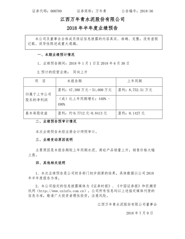 萬年青公告,預(yù)計2018年半年度實現(xiàn)歸屬于上市公司股東的凈利潤4.73億元–5.16億元,同比增長440%-490%。主要原因是本報告期較上年同期水泥、商砼產(chǎn)品銷量上升,銷售價格大幅上漲。