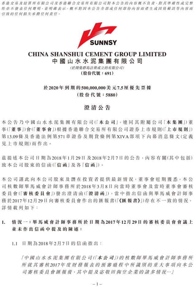 畢馬威進一步表明,公司發(fā)布的公告與該會計師事務所在2017年12月29日向公司審核委員會作出的《匯報書》存在不一致,畢馬威曾在2018年3月8日向當時公司董事會和審核委員會發(fā)出了澄清函,但這份澄清函并未對外公布。當時,山水水泥董事會一直由公司第一大股東天瑞集團提名人員占據(jù)。