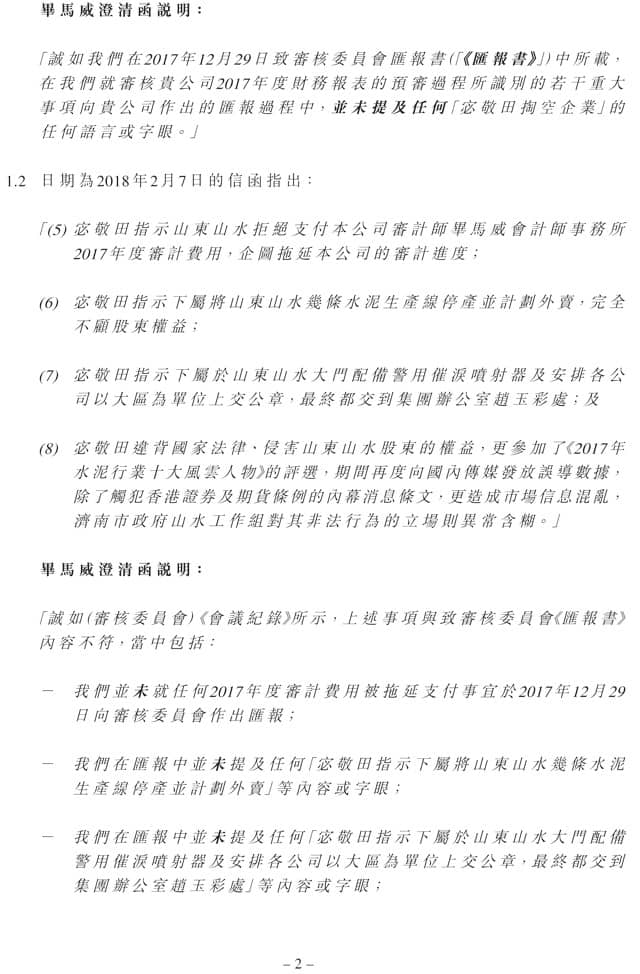 針對“計劃出售生產(chǎn)線”一項,畢馬威表示,“我們在匯報中并未提及任何‘宓敬田指示下屬將山東山水幾條水泥生產(chǎn)線停產(chǎn)并計劃外賣’等內(nèi)容或字眼。”