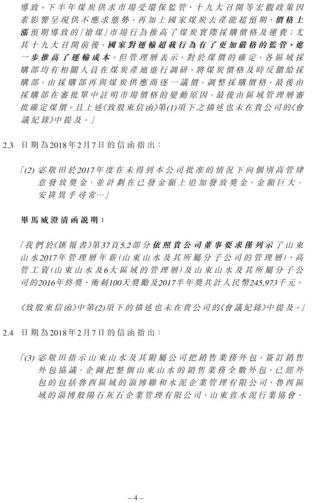 對于“將銷售業(yè)務外包、致企業(yè)于死地”,畢馬威澄清,該事務所在匯報中的實際說法是:“銷售平臺是山東山水與附屬公司與行業(yè)內(nèi)聯(lián)合成立的協(xié)同市場價格的平臺組織,各自企業(yè)的銷售業(yè)務仍由各自企業(yè)銷售人員負責。”并不是上述 《致股東函》中所述的“銷售業(yè)務外包”。