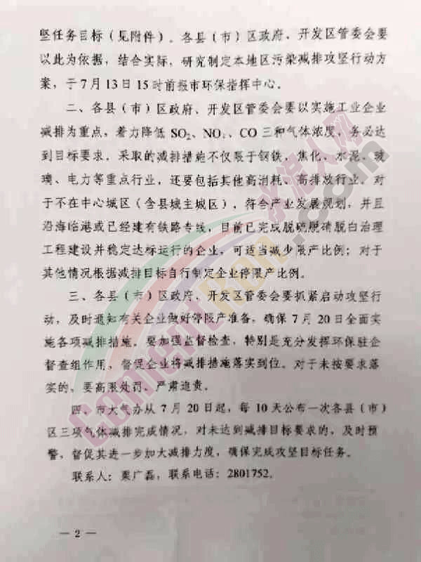 二、各縣(市)區(qū)政府、開發(fā)區(qū)管委會要以實施工業(yè)企業(yè)減排為重點,著力降低SO?、NO?、CO三種氣體濃度,務(wù)必達到目標(biāo)要求,采取的減排措施不僅限于鋼鐵、焦化、水泥、玻璃、電力等重點行業(yè),還要包括其他高能耗、高排放行業(yè)。對于不在中心城區(qū)(含縣城主城區(qū)),符合產(chǎn)業(yè)發(fā)展規(guī)劃,并且沿海臨港或已經(jīng)建有鐵路專線,目前已完成脫硫脫硝脫白治理工程建設(shè)并穩(wěn)定達標(biāo)運行的企業(yè),可適當(dāng)減少限產(chǎn)比例;對于其他情況根據(jù)減排目標(biāo)自行制定企業(yè)停限產(chǎn)比例。