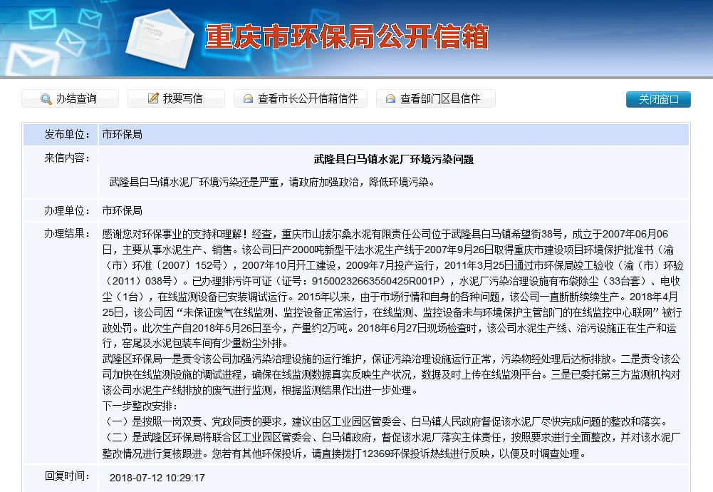 針對此事環(huán)保局組織相關調查后回復稱,重慶市山拔爾桑水泥有限責任公司位于武隆縣白馬鎮(zhèn)希望街38號,成立于2007年06月06日,主要從事水泥生產、銷售業(yè)務。