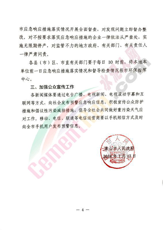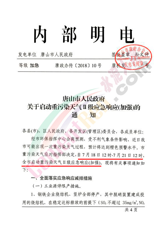 7月11日唐山市生態(tài)環(huán)境保護工作領導小組發(fā)布關于大氣污染物減排攻堅行動的通知。通知稱:為圓滿完成全年空氣質量改善目標任務,按照2018年7月9日全市“十項重點工作”調(diào)度會議精神,河北省唐山市決定自7月20日至8月31日在全市開展SO?、NO?、CO污染減排攻堅行動,要求各縣(市)區(qū)政府、開發(fā)區(qū)管委會要抓緊啟動攻堅行動,及時通知鋼鐵、焦化、水泥、玻璃、電力等企業(yè)做好停限產(chǎn)準備,確保7月20日全面實施各項減排措施。(相關鏈接:7月20日起這個地區(qū)水泥企業(yè)或將全面停限產(chǎn)!!)