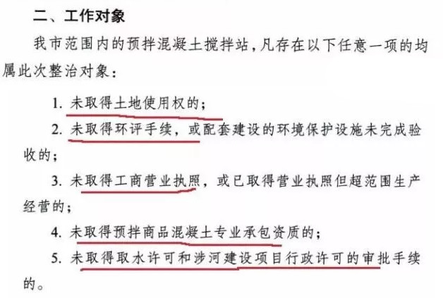 此次整治對象:(1)未取得土地使用權(quán)的;(2)未取得環(huán)評手續(xù),或配套建設(shè)的環(huán)境保護設(shè)施未完成驗收的;(3)未取得工商營業(yè)執(zhí)照,或已取得營業(yè)執(zhí)照但超范圍生產(chǎn)經(jīng)營的;(4)未取得預(yù)拌商品混凝土專業(yè)承包資質(zhì)的;(5)未取得取水許可和涉河建設(shè)項目行政許可的審批手續(xù)的。