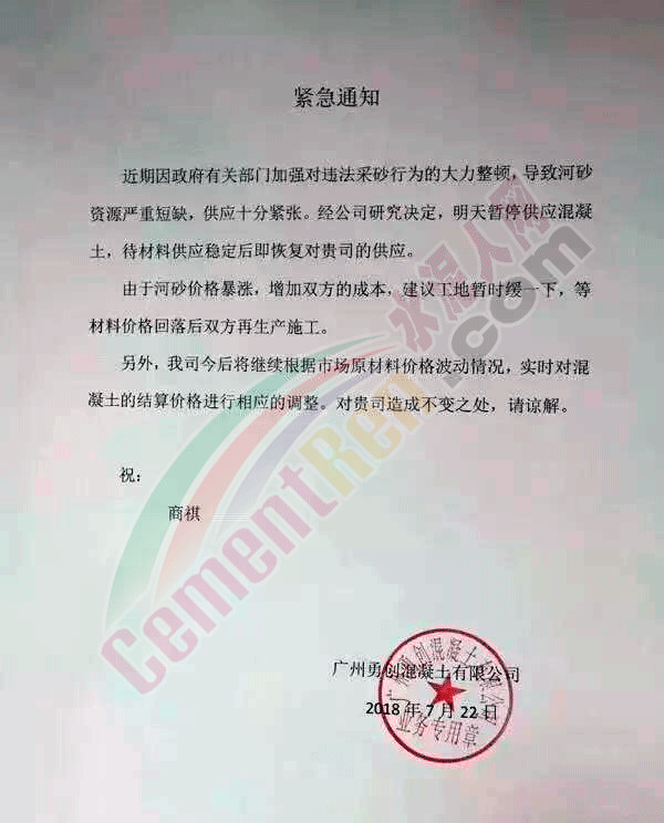 廣州勇創(chuàng)混凝土有限公司緊急通知稱,近期政府有關(guān)部門加強(qiáng)對(duì)違法采砂行為的大力整頓,導(dǎo)致河砂資源嚴(yán)重短缺,供應(yīng)十分緊張。經(jīng)公司研究決定,自明天(23日)暫停供應(yīng)混凝土,待材料供應(yīng)穩(wěn)定后即恢復(fù)對(duì)客戶的供應(yīng)。