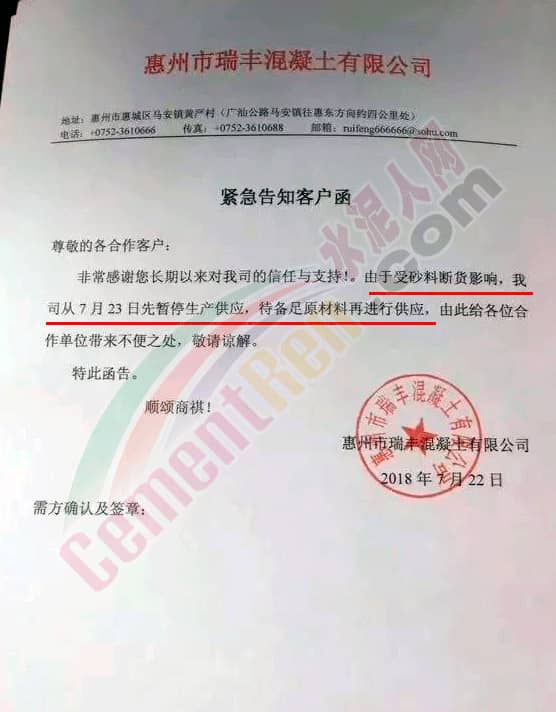 惠州市瑞豐混凝土有限公司緊急告知客戶函稱,由于受砂料斷貨影響,自7月23日停產(chǎn)停供,待備足原材料再進(jìn)行供應(yīng)。