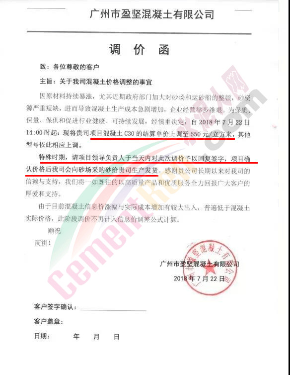 廣州市盈堅(jiān)混凝土有限公司調(diào)價(jià)函稱,因原材料持續(xù)暴漲,尤其近期政府部門加大對(duì)砂場(chǎng)和運(yùn)砂船的整頓,砂資源嚴(yán)重短缺,進(jìn)而導(dǎo)致混凝土生產(chǎn)成本急劇增加,企業(yè)經(jīng)營(yíng)舉步維艱。為保質(zhì)、保量、保供和促進(jìn)行業(yè)健康、可持續(xù)發(fā)展,經(jīng)慎重決定:自2018年7月22日14時(shí)起將混凝土C30的結(jié)算單價(jià)上調(diào)至550元/立方米,其他型號(hào)依此相應(yīng)上調(diào)。