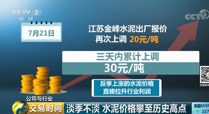 7月21日,江蘇金峰水泥出廠報價再次上調(diào)20元/噸,三天內(nèi)累計上調(diào)30元/噸,領(lǐng)漲區(qū)域市場。反季上漲的水泥價格,也直接拉升了行業(yè)利潤。