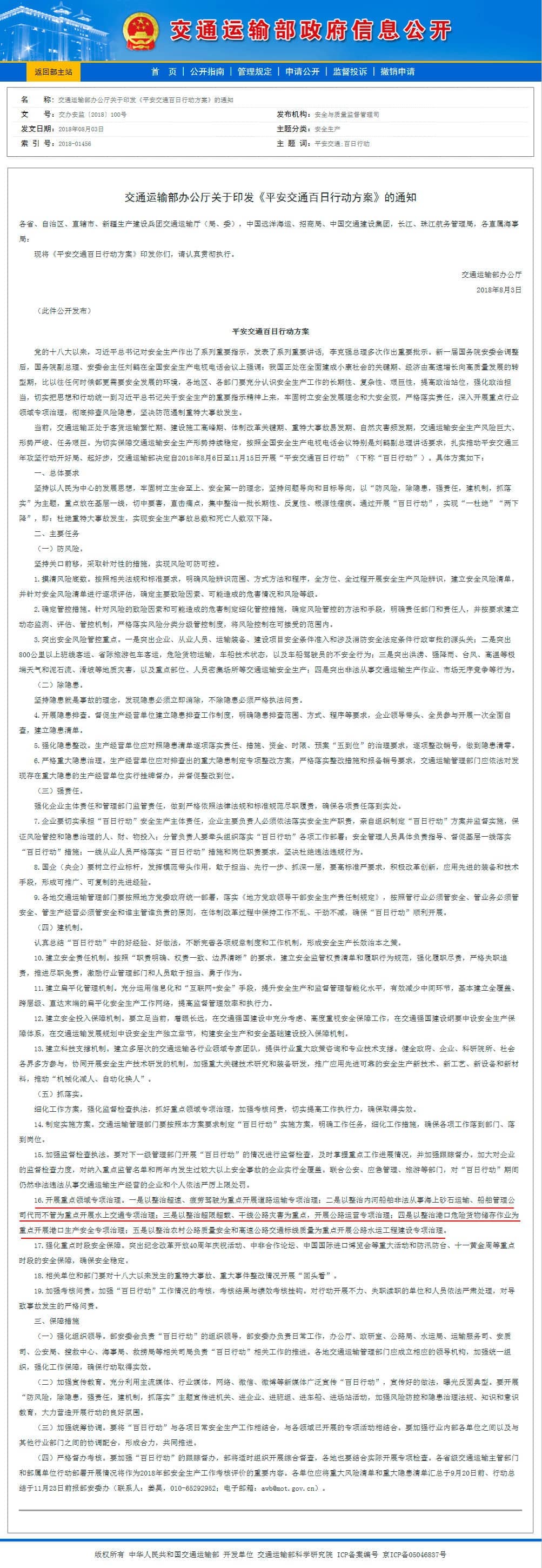 為切實(shí)保障交通運(yùn)輸安全生產(chǎn)形勢(shì)持續(xù)穩(wěn)定,交通運(yùn)輸部辦公廳日前發(fā)布了《平安交通百日行動(dòng)方案》(下稱《方案》),決定自2018年8月6日至11月15日開(kāi)展“平安交通百日行動(dòng)”(下稱“百日行動(dòng)”)。