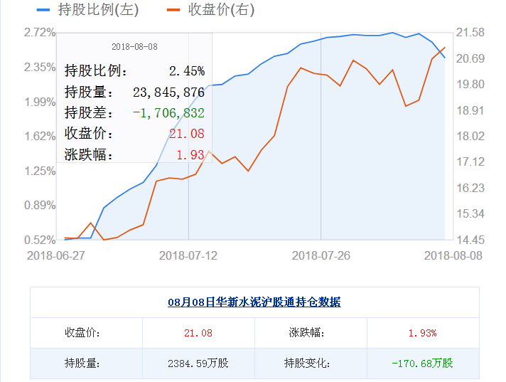 【水泥人網】數(shù)據顯示,截至08月08日華新水泥于滬股通持股量為2384.59萬股,占其A股股本比例為2.45%,比上一交易日減少170.68萬股。 據數(shù)據統(tǒng)計,該股近一個月內累計漲幅為40.81%,滬股通累計加倉1277.70萬,滬股通持倉累計變化比例為115.43%,近三個月內累計漲幅為43.14%,滬股通累計加倉2250.48萬,滬股通持倉累計變化比例為1678.07%。