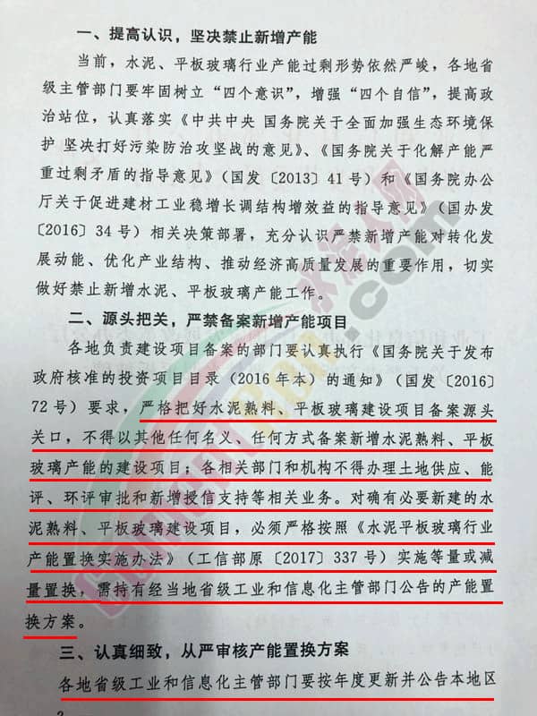 各地負責(zé)建設(shè)項目備案的部門要認真執(zhí)行《國務(wù)院關(guān)于發(fā)布政府核準(zhǔn)的投資項目目錄(2016年本)的通知》(國發(fā)[2016]72號)要求,嚴格把好水泥熟料、平板玻璃建設(shè)項目備案源頭關(guān)口,不得以其他任何名義、任何方式備案新增水泥熟料、平板玻璃產(chǎn)能的建設(shè)項目;各相關(guān)部門和機構(gòu)不得辦理土地供應(yīng)、能評、環(huán)評審批和新增授信支持等相關(guān)業(yè)務(wù)。對確有必要新建的水泥熟料、平板玻璃建設(shè)項目,必須嚴格按照《水泥平板玻璃行業(yè)產(chǎn)能置換實施辦法》(工信部原[2017]337號)實施等量或減量置換,需持有經(jīng)當(dāng)?shù)厥〖壒I(yè)和信息化主管部門公告的產(chǎn)能置換方案。