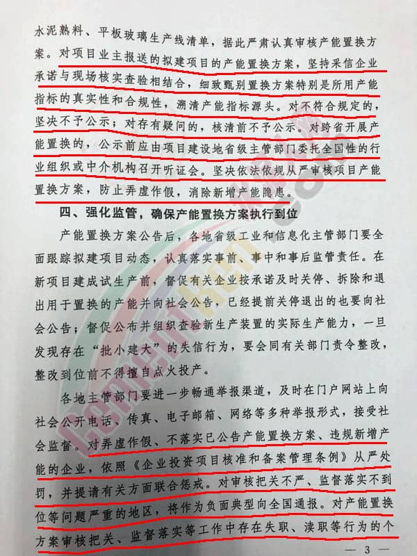各地省級工業(yè)和信息化主管部門要按年度更新并公告本地區(qū)水泥熟料、平板玻璃生產(chǎn)線清單,據(jù)此嚴肅認真審核產(chǎn)能置換方案。對項目業(yè)主報送的擬建項目的產(chǎn)能置換方案,堅持采信企業(yè)承諾與現(xiàn)場核實查驗相結(jié)合,細致甄別置換方案特別是所用產(chǎn)能指標(biāo)的真實性和合規(guī)性,溯清產(chǎn)能指標(biāo)源頭。對不符合規(guī)定的,堅決不予公示;對存有疑問的,核清前不予公示。對跨省開展產(chǎn)能置換的,公示前應(yīng)由項目建設(shè)地省級主管部門委托全國性的行業(yè)組織或中介機構(gòu)召開聽證會。堅決依法依規(guī)從嚴審核項目產(chǎn)能置換方案,防止弄虛作假,消除新增產(chǎn)能隱患。