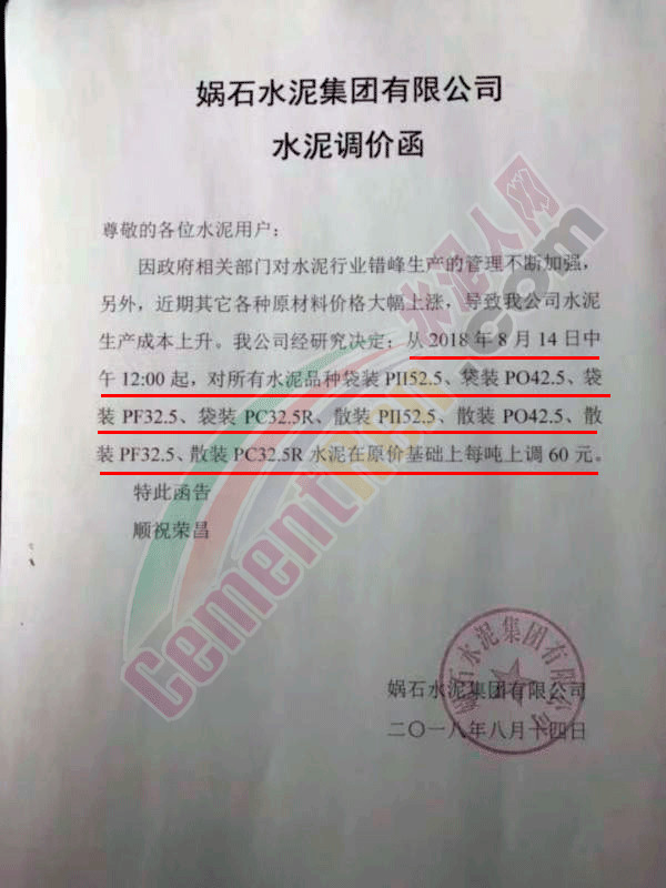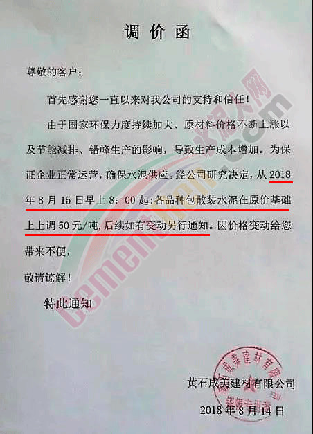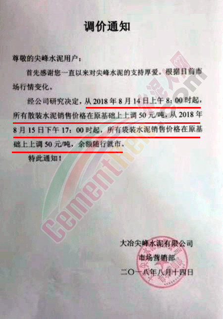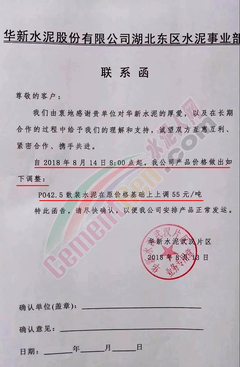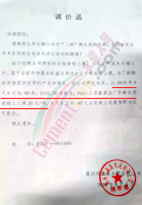 【水泥人網(wǎng)】繼上周河南地區(qū)宣布全區(qū)域提價之后,湖北部分地區(qū)也通知客戶上調出廠價格,漲幅在50-65元/噸。據(jù)水泥人網(wǎng)了解,目前區(qū)域內(nèi)水泥熟料庫位較低,加之進入八月中旬下游需求有所提升。調提價通知如下: