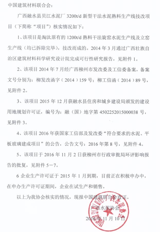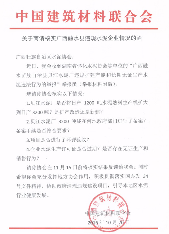 對(duì)此,懷化水泥協(xié)會(huì)于2016年10月12日,向中國(guó)建材聯(lián)合會(huì)及國(guó)家有關(guān)部門舉報(bào)了該公司的違法違規(guī)行為,得到了中國(guó)建材聯(lián)合會(huì)的高度重視,并于2016年10月20日向廣西自治區(qū)水泥協(xié)會(huì)發(fā)出了《關(guān)于商請(qǐng)核實(shí)廣西融水縣違規(guī)水泥企業(yè)情況的函》(見附件三)。