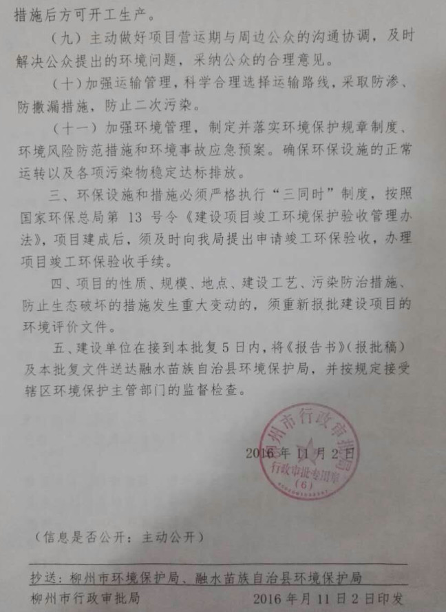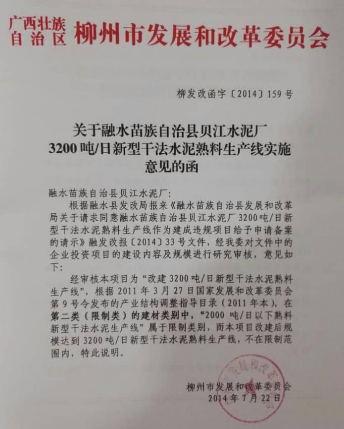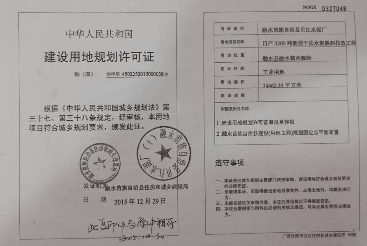 從廣西水泥協(xié)會(huì)2016年11月10日給聯(lián)合會(huì)的回復(fù)函中(見附件四),可以看到,這個(gè)技改項(xiàng)目是在2014年8月20日正式投產(chǎn)前的一個(gè)月,才分別于7月16日和7月22日,到柳州市經(jīng)信委和發(fā)改委進(jìn)行備案。柳州市工信委只是出具了一個(gè)《初審意見》(見附件五),柳州市發(fā)改委出具的則只是一個(gè)帶證明性質(zhì)的《意見函》(見附件六),根本沒有獲得省級(jí)政府主管部門以上的技改核準(zhǔn)文件;而且建設(shè)用地規(guī)劃許可證,是在投產(chǎn)后一年多以后的2015年12月29日才獲得批準(zhǔn)的(見附件七);環(huán)境影響報(bào)告書也是到投產(chǎn)兩年多以后的2016年11月2日,才得到柳州市行政審批局的批復(fù)文件(見附件八)。