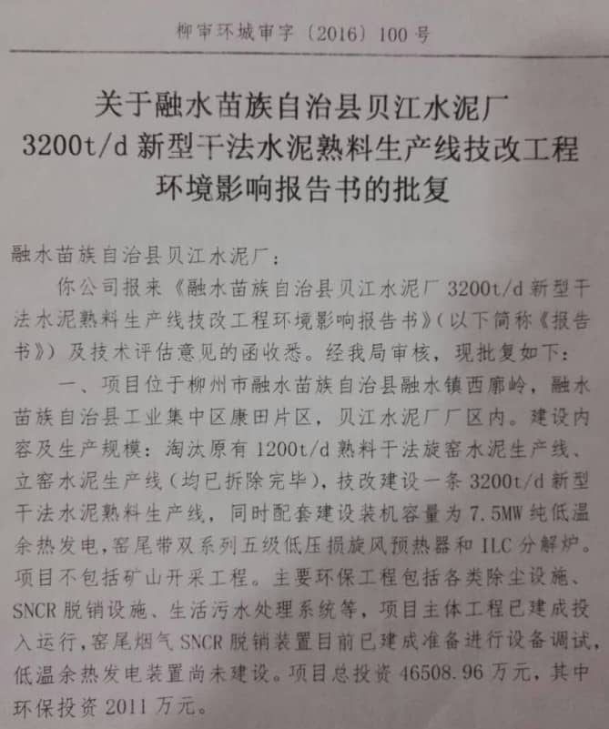 1、強(qiáng)行技改,違規(guī)擴(kuò)建。融水縣貝江水泥有限公司原來(lái)是一條日產(chǎn)1200噸熟料的水泥生產(chǎn)線。2013年,該公司在沒有獲得廣西自治區(qū)經(jīng)信委的核準(zhǔn)文件,沒有獲得建設(shè)項(xiàng)目用地批文,沒有獲得環(huán)境影響報(bào)告書批復(fù)等必備手續(xù)的情況下,借技改之名,擅自將日產(chǎn)1200噸生產(chǎn)線擴(kuò)大到日產(chǎn)3200噸。在項(xiàng)目的擴(kuò)建期間,國(guó)務(wù)院國(guó)發(fā)〔2013〕41號(hào)文件明文規(guī)定“各地方、各部門不得以任何名義、任何方式核準(zhǔn)、備案產(chǎn)能嚴(yán)重過(guò)剩行業(yè)新增產(chǎn)能項(xiàng)目”;國(guó)家發(fā)改委、工信部發(fā)改產(chǎn)業(yè)[2013]892號(hào)文件三令五申“對(duì)未批先建、邊批邊建、越權(quán)核準(zhǔn)的違規(guī)項(xiàng)目,尚未開工建設(shè)的,不準(zhǔn)開工,正在建設(shè)的項(xiàng)目,要停止建設(shè)”。但是該公司對(duì)國(guó)家三令五申的產(chǎn)業(yè)政策和法律法規(guī)置若罔聞,仍然我行我素,強(qiáng)行技改,并于2014年8月20日強(qiáng)行投產(chǎn)。