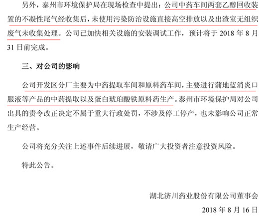 企業(yè)上市公司8月16日公告顯示,2018年7月3-4日,泰州市環(huán)境保護局對公司廢水、廢渣及廢氣的處理情況進行了現(xiàn)場檢查。根據(jù)《泰興市環(huán)境監(jiān)測站監(jiān)測報告(環(huán)監(jiān)(氣)字(2018)第(074)號)》,濟川藥業(yè)集團有限公司廢氣排放口(西廠)非甲烷總烴排放濃度均值超標0.08倍。
