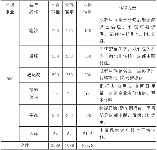 2、經(jīng)研討,成都中聯(lián)散裝核心客戶散裝最低日需求量1089噸。