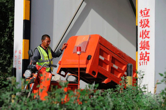 8月21日,在河北省武安市曹公泉村垃圾收集站,保潔人員將收集來的垃圾倒入地埋式垃圾箱