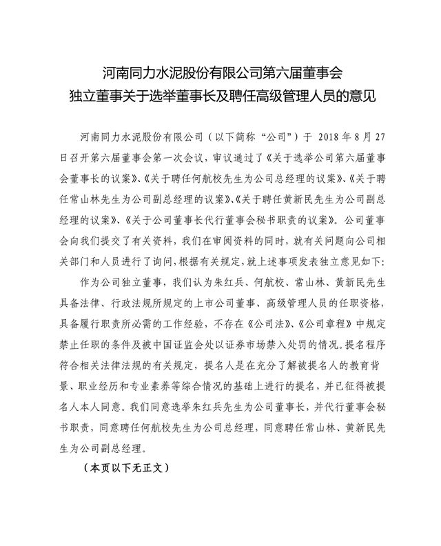 【水泥人網(wǎng)】8月27日晚間,同力水泥(000885)發(fā)布公告,公司于當日召開2018年第二次臨時股東大會及第六屆董事會第一次會議,選舉朱紅兵為同力水泥第六屆董事會董事長。聘任何航校為同力水泥總經(jīng)理,聘任常山林、黃新民為同力水泥副總經(jīng)理。董事會秘書、證券事務代表人選已選定,待獲得深圳證券交易所相關資格后聘任,根據(jù)深交所有關規(guī)定,暫由董事長代為履行董事會秘書職責。
