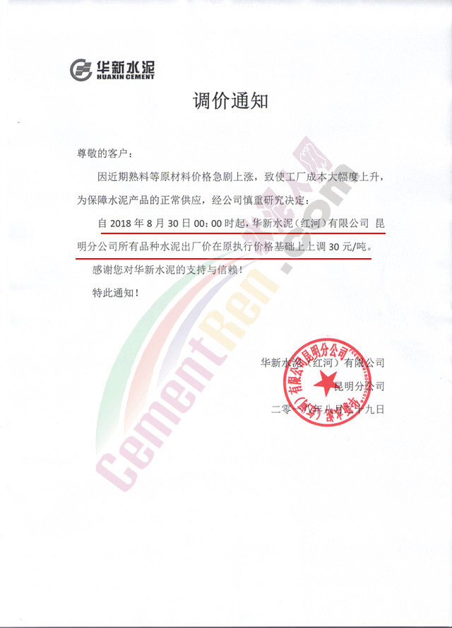 區(qū)域主導(dǎo)企業(yè)華新水泥(紅河)有限公司調(diào)價(jià)通知稱(chēng),因近期熟料等原材料價(jià)格急劇上漲,致使工廠成本大幅度上升,為保障水泥產(chǎn)品的正常供應(yīng),經(jīng)公司慎重研究決定,自今日(8月30日)零點(diǎn)起紅河公司 昆明分公司所有品種水泥出廠價(jià)在原執(zhí)行價(jià)格基礎(chǔ)上上調(diào)30元/噸。