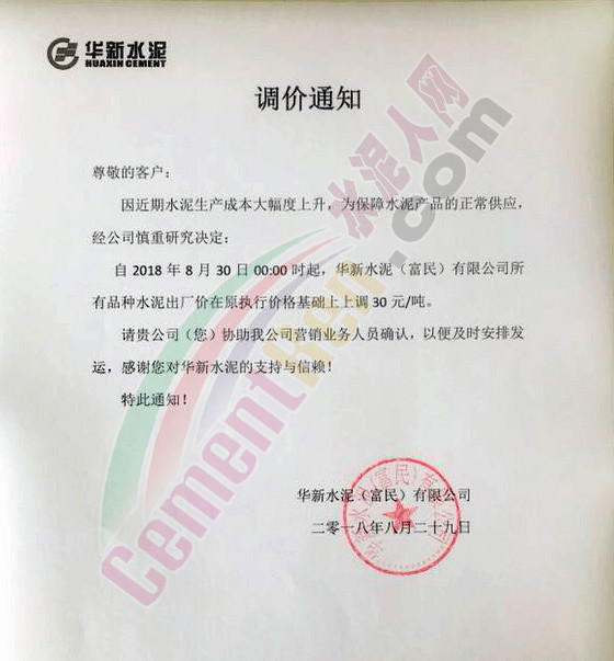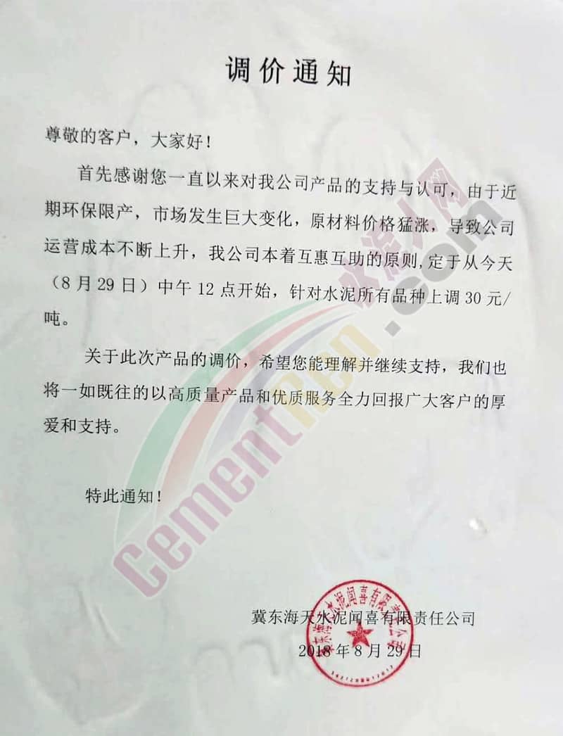 昨日(29日),聞喜冀東也發(fā)布了調(diào)價(jià)通知。調(diào)價(jià)通知稱(chēng),由于近期環(huán)保限產(chǎn),市場(chǎng)發(fā)生巨大變化,原材料價(jià)格猛漲,導(dǎo)致公司運(yùn)營(yíng)成本不斷上升,定于8月29日中午12點(diǎn)起針對(duì)水泥所有品種上調(diào)30元/噸。