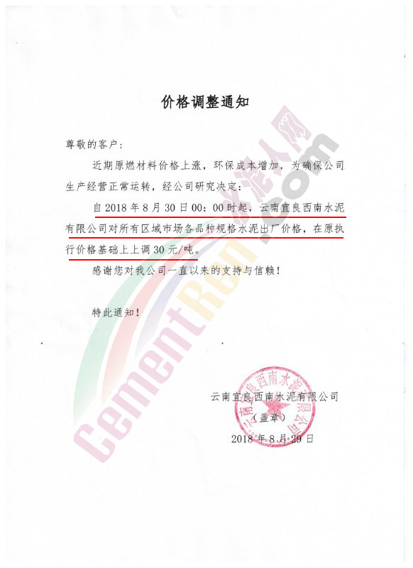 區(qū)域龍頭企業(yè)云南宜良西南水泥有限公司價(jià)格調(diào)整通知稱(chēng),因近期原燃材料價(jià)格上漲,環(huán)保成本增加,為確保公司生產(chǎn)經(jīng)營(yíng)正常運(yùn)轉(zhuǎn),經(jīng)公司研究決定,自今日(8月30日)零點(diǎn)起,云南宜良西南水泥有限公司對(duì)所有區(qū)域市場(chǎng)各品種規(guī)格水泥出廠價(jià)格,在原執(zhí)行價(jià)格基礎(chǔ)上上調(diào)30元/噸。